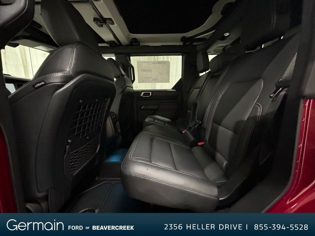 This superb-looking 2025 Ford Bronco Badlands is loaded with the following Factory Options: Equipment Group 334A Lux Package (2-Door Intelligent Access w/Lock/Unlock, 360-Degree Camera, Adaptive Cruise Control, Ambient Footwell Lighting, Connected Navigation, Dr & Pass Illuminated Sliding Visor Vanity Mirrors, Dual Smart Charging USB Ports, Dual-Zone Electronic Automatic Temperature Control, Evasive Steering Assist, Front Parking Sensors, Front Row Heated Seats, Information on Demand Panel, Power Outlet - Back Side of Center Floor Console, Radio: B&O Sound System by Bang & Olufsen, Rear Parking Sensors, Sideview Mirrors, and Universal Garage Door Opener), Sasquatch Package (High Clearance Fender Flares, High Clearance Suspension, Position-Sensitive Bilstein Shock Absorbers, and Wheels: 17 Carbonized Gray Painted Aluminum), 4-Wheel Disc Brakes, 7 Speakers, ABS brakes, Air Conditioning, Alloy wheels, AM/FM radio: SiriusXM with 360L, AM/FM Stereo, Auto High-Beam Headlamps, Auto High-beam Headlights, Auto-dimming Rear-View mirror, BLIS Blind Spot Information System, Brake assist, Compass, Delay-off headlights, Driver door bin, Driver vanity mirror, Dual front impact airbags, Dual front side impact airbags, Electronic Stability Control, Emergency communication system: 911 Assist, Exterior Parking Camera Rear, Front anti-roll bar, Front Bucket Seats, Front Center Armrest, Front fog lights, Front reading lights, Front wheel independent suspension, Fully automatic headlights, Hard Top Sound Deadening Headliner, Heated door mirrors, Heated front seats, Heated steering wheel, Illuminated entry, Integrated roll-over protection, Internet access capable: FordPass Connect, Lane-Keeping System, Leather Shift Knob, Low tire pressure warning, Marine Grade Vinyl Heated Bucket Seats, Occupant sensing airbag, Outside temperature display, Overhead airbag, Overhead console, Panic alarm, Passenger door bin, Passenger vanity mirror, Power door mirrors, Power steering, Power windows, Pre-Collision Assist w/Automatic Emergency Braking, Radio data system, Rear-View Camera, Rear-Window Defroster & Washer, Remote keyless entry, Security system, Shadow Black Painted Hard Top, SiriusXM w/360L, Speed control, Split folding rear seat, Steering wheel mounted audio controls, SYNC 4, Tachometer, Telescoping steering wheel, Tilt steering wheel, Traction control, Trip computer, Variably intermittent wipers, Voltmeter, and Wheels: 17 Carbonized Gray-Painted Aluminum.