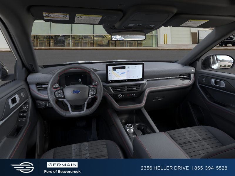 This good-looking 2026 Ford Explorer ST-Line is loaded with the following Factory Options: 4WD, 10 Speakers, 3rd row seats: bench, 4-Wheel Disc Brakes, ABS brakes, Air Conditioning, Alloy wheels, AM/FM radio: SiriusXM with 360L, Apple CarPlay/Android Auto, Auto High-beam Headlights, Automatic temperature control, Brake assist, Bumpers: body-color, Compass, Delay-off headlights, Driver door bin, Driver vanity mirror, Dual front impact airbags, Dual front side impact airbags, Electronic Stability Control, Emergency communication system: 911 Assist, Exterior Parking Camera Rear, Four wheel independent suspension, Front anti-roll bar, Front Bucket Seats, Front Center Armrest, Front dual zone A/C, Front fog lights, Front reading lights, Fully automatic headlights, Garage door transmitter, Heated door mirrors, Heated front seats, Heated steering wheel, Heated Unique Cloth Captain's Chairs, Illuminated entry, Knee airbag, Leather steering wheel, Low tire pressure warning, Navigation System, Occupant sensing airbag, Outside temperature display, Overhead airbag, Overhead console, Panic alarm, Passenger door bin, Passenger vanity mirror, Power door mirrors, Power driver seat, Power Liftgate, Power passenger seat, Power steering, Power windows, Radio: B&O Sound System by Bang and Olufsen, Rear air conditioning, Rear anti-roll bar, Rear reading lights, Rear window defroster, Rear window wiper, Remote keyless entry, Security system, Speed control, Speed-sensing steering, Speed-Sensitive Wipers, Split folding rear seat, Spoiler, Steering wheel mounted audio controls, Tachometer, Telescoping steering wheel, Tilt steering wheel, Traction control, Trip computer, Variably intermittent wipers, and Wheels: 20 Ebony-Painted Machined Aluminum.