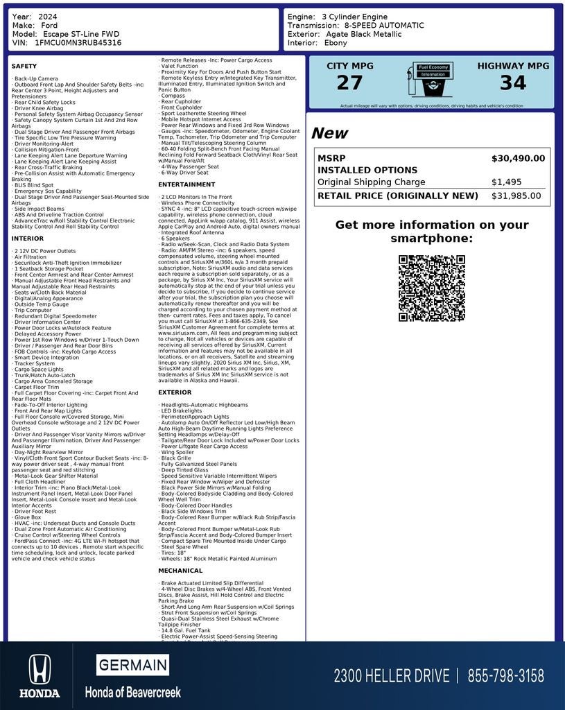 - Fuel Economy Est-Combined (MPG): 30 (Est)